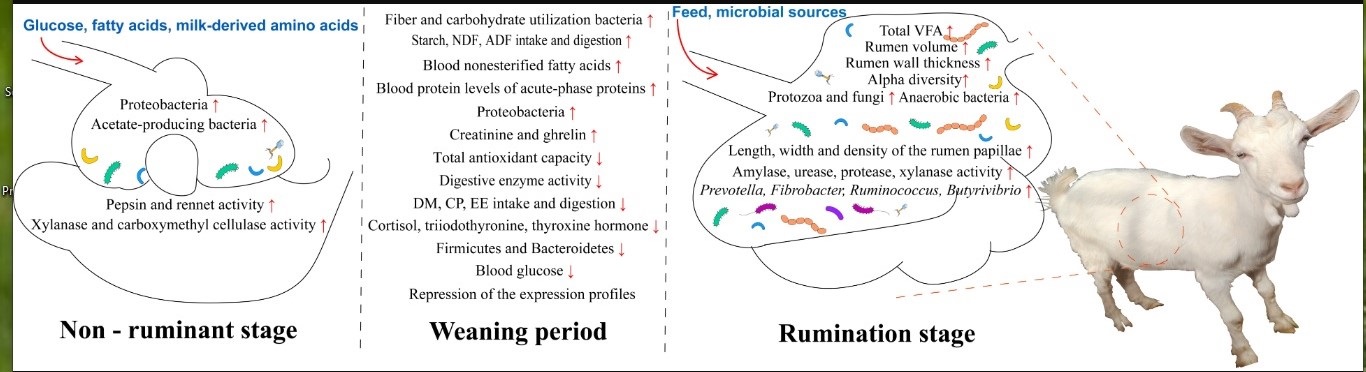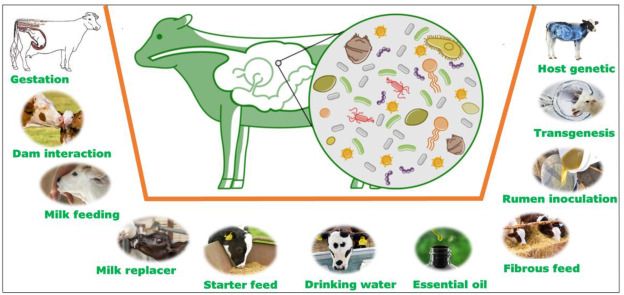 میکروارگانیسم های شکمبه از بعد از زایش در اثر ارتباط متقابل با والدین، زمان شیر خوارگی و تحت تآثیر افزودنیهایی نظیر جایگزین شیر و استارترها، آب آشامیدنی، روغن های ضروری ، خوراک های فیبری و خوراک های میکربی(DFM) و پروبیوتیک ها و یا در حیوانات تراریخته می توانند تحت تأثیر قرار گیرند.