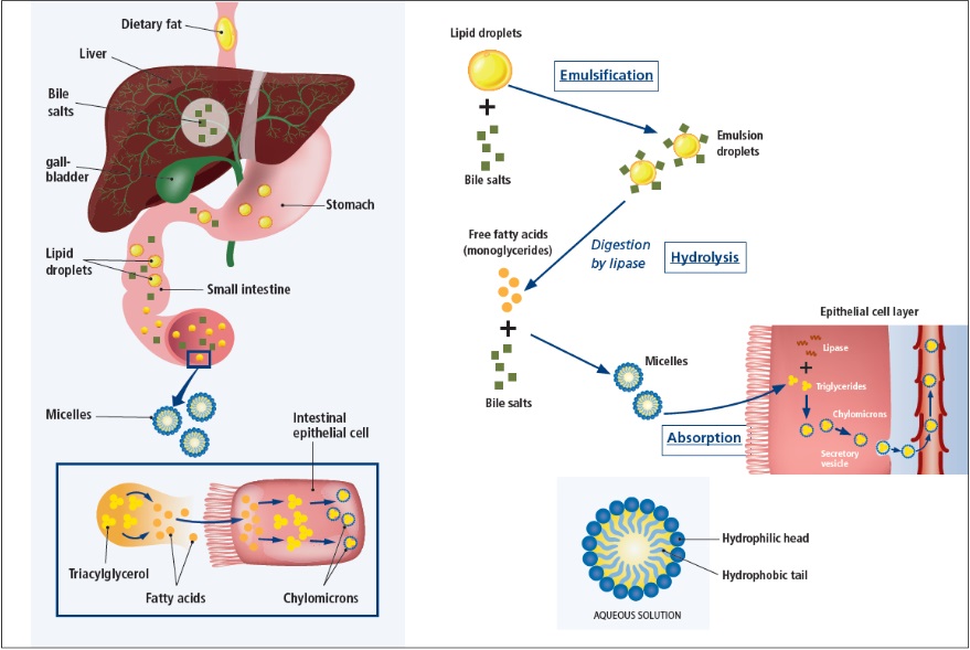 - افزایش سطح تماس چربی با لیپاز → بهبود هیدرولیز تریگلیسریدها به مونوگلیسرید و اسید چرب.